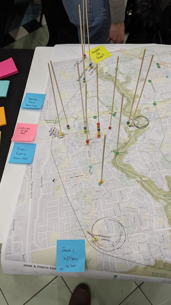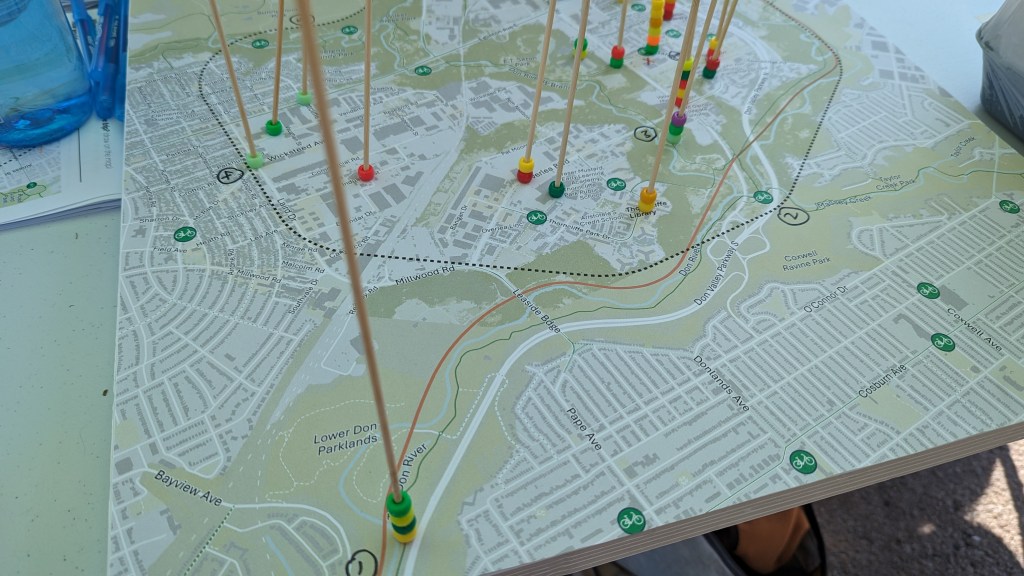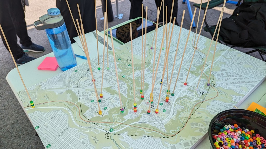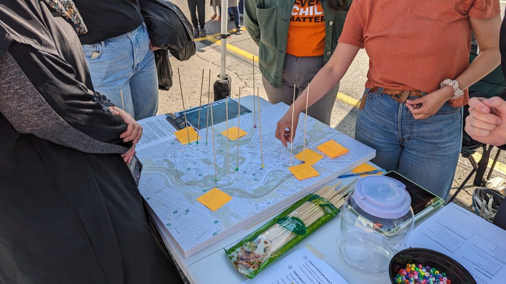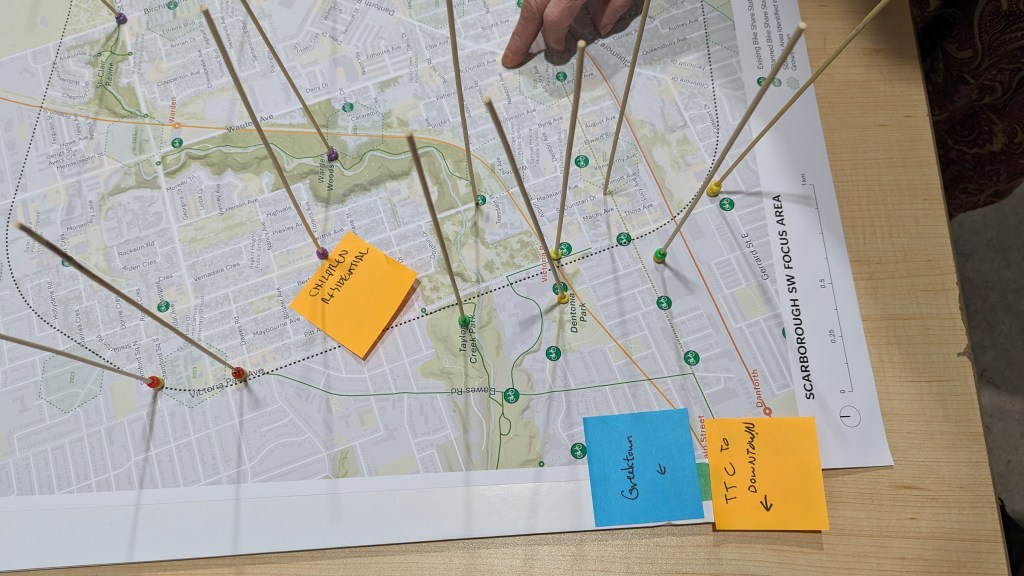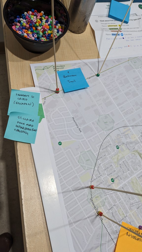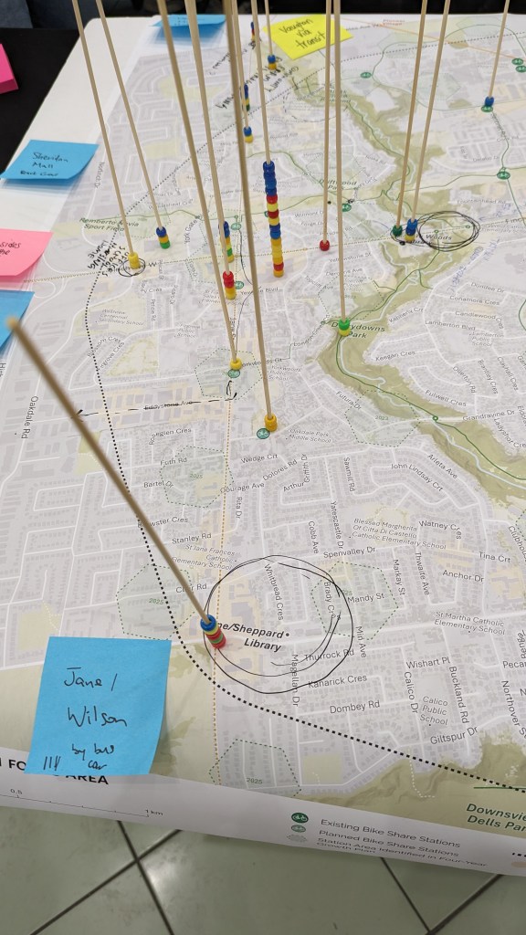 Our team led the design of the pop-up engagement with the objective of making the activity fun, interactive, mobile, and accessible while ensuring the public’s input was informative to the technical process of station planning. We invited participants to use wooden skewers to identify regular destinations in the community on a large map, then insert colour-coded beads through the skewers to indicate their current modes of transportation to access these locations. Simple, colourful, and tactile, this activity prompted many conversations between participants and the project team on the opportunities and challenges regarding the use of bike share in the community.