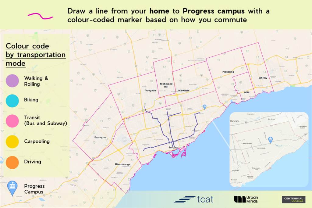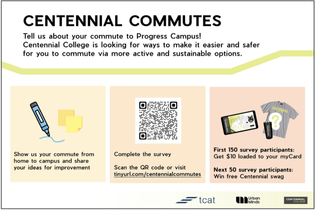 Centennial College partnered with The Centre for Active Transportation (TCAT) and Urban Minds to engage students and staff at Progress Campus during March and April of 2023.