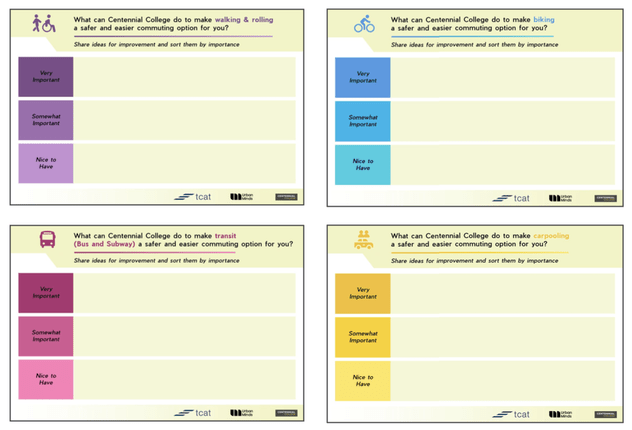 Participants are asked to share ideas on what Centennial College could do to make each active and sustainable travel mode a safer and easier commuting option for them. They then sort the ideas based on importance, from “very important” to “somewhat important” to “nice to have”.