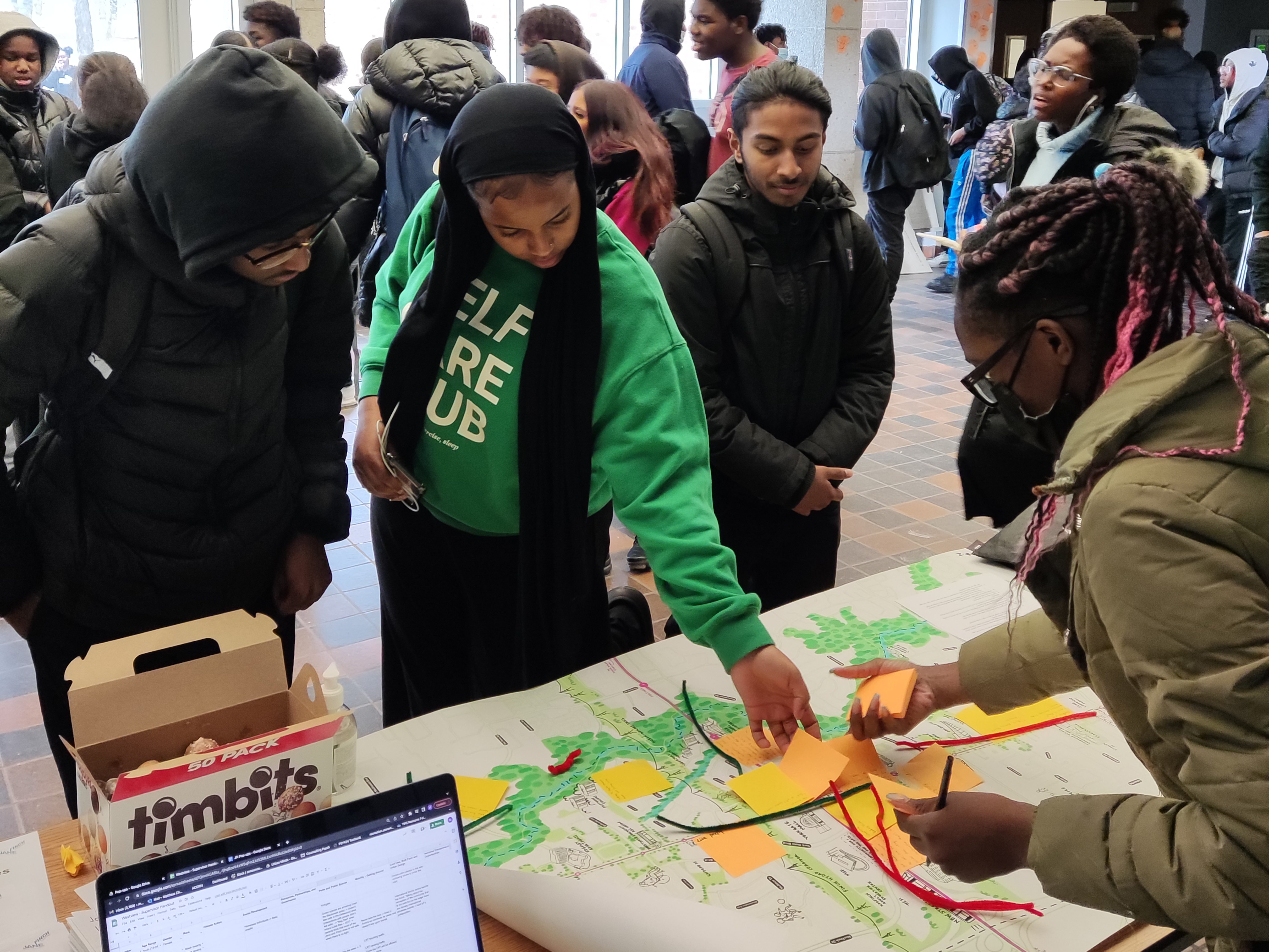 Following the pop-ups, we hosted an Idea Jam with local high school students. The goal of the Idea Jam was to identify how to address these challenges so that the Jane Finch area remains equitable and inclusive. This event featured multiple forms of engagement, including a welcome survey, collective mapping, and vision boarding. City of Toronto and Perkins & Will staff were in attendance to converse with students throughout the event.